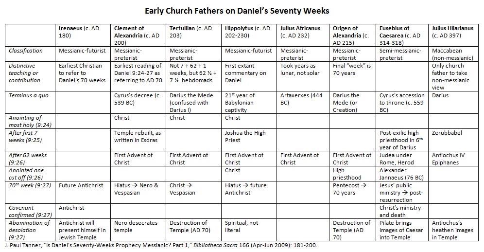 Lastly, if you’re wondering how the early church fathers handled this prophecy, I’ve compiled this chart based on a helpful article by J. Paul Tanner in Bibliotheca Sacra (available online here):