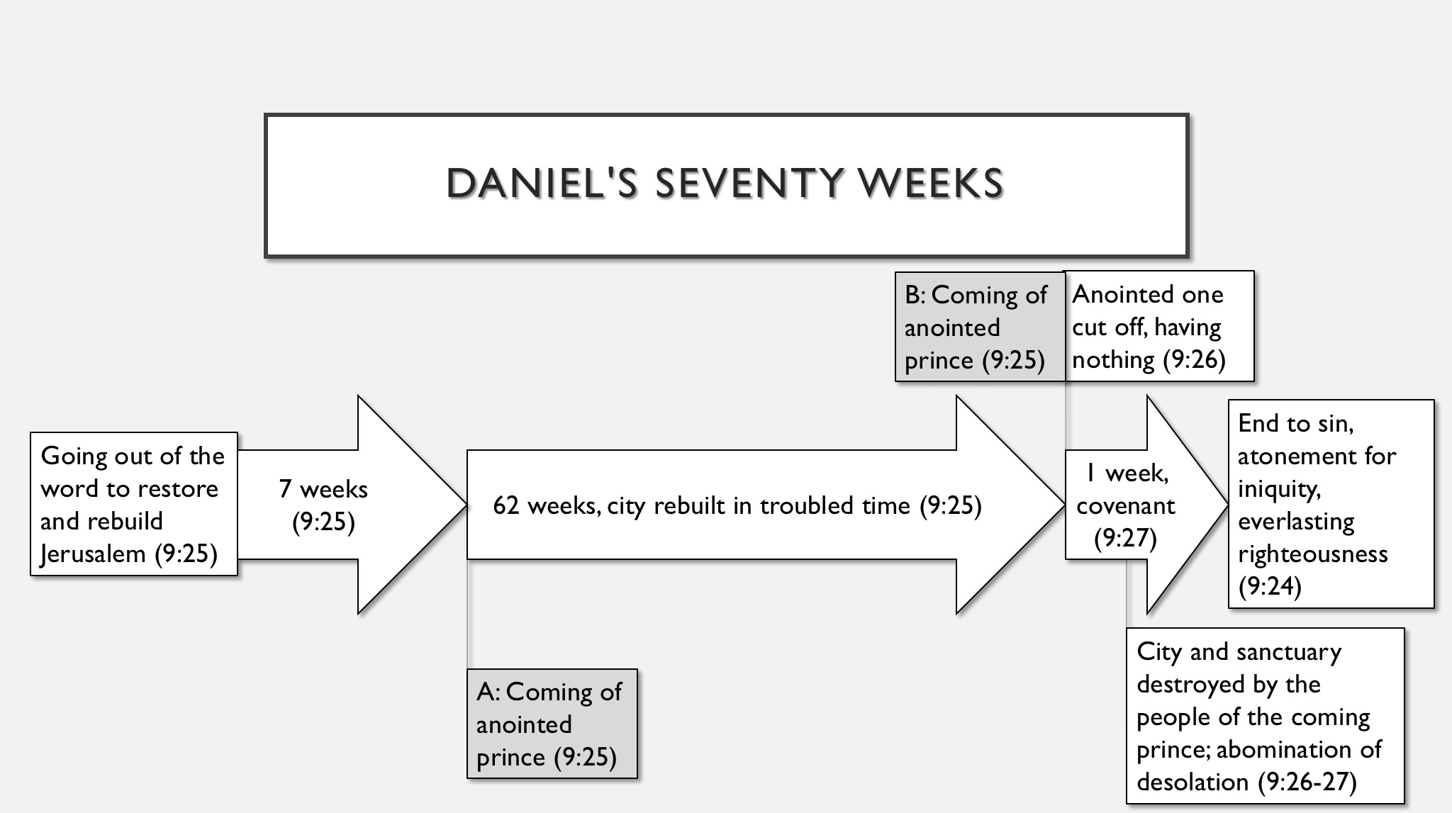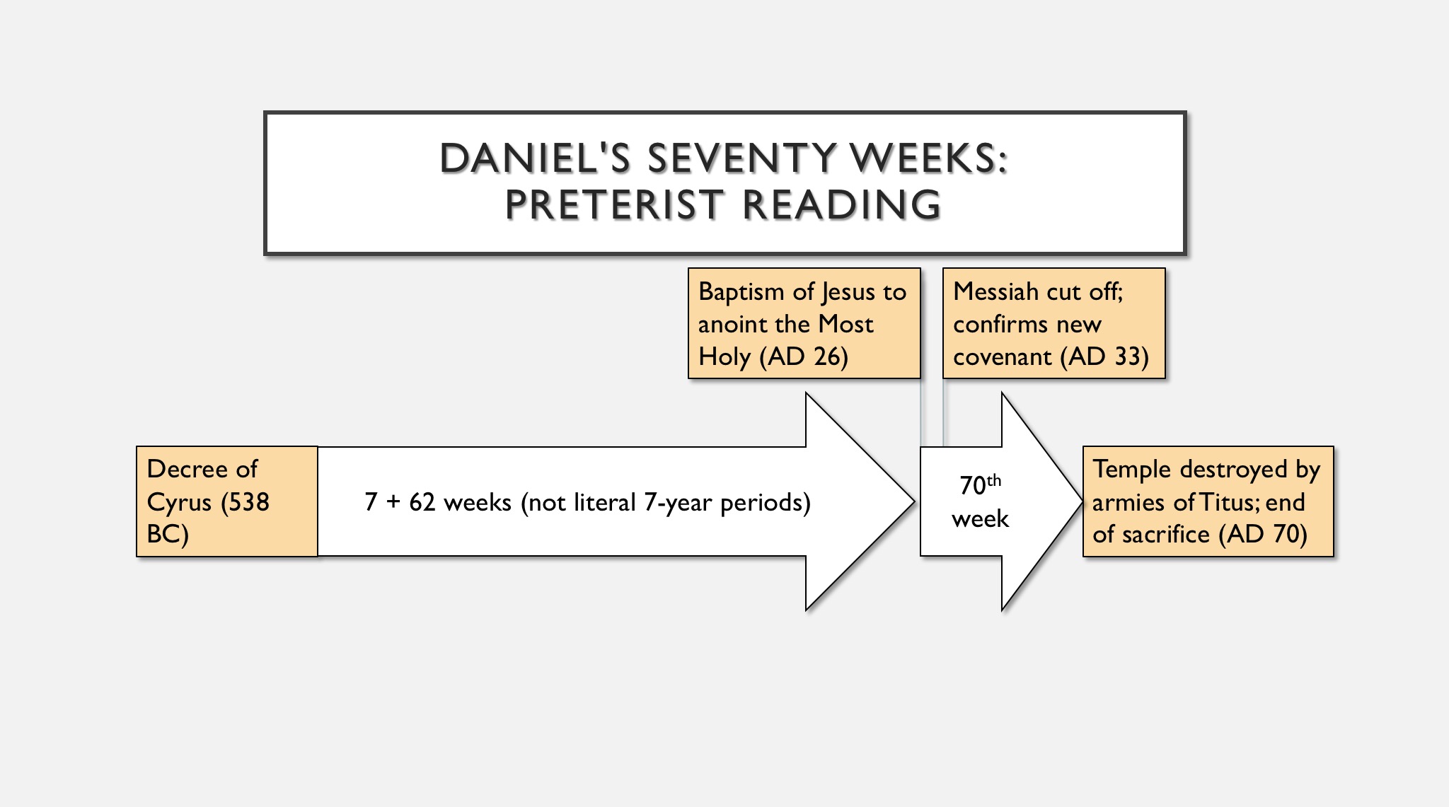 The preterist view considers the prophecy to have been fulfilled by AD 70. By interpreting the “weeks” symbolically, preterists have more flexibility in determining the dates of the events predicted. They understand the “word to rebuild Jerusalem” as the decree of Persian king Cyrus in 538 BC. The “anointed one” in both v. 25 and v. 26 is Jesus, who is also regarded as the one who confirms the “strong covenant” of v. 27, and whose atoning work rendered the Jewish sacrifices obsolete and even abominable to God. Titus is the “prince to come,” whose armies destroyed the Jewish Temple in Jerusalem. Here’s what it looks like: