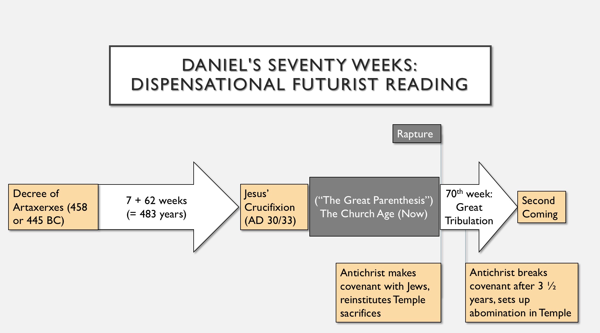 The dispensationalist view distinguishes between those prophecies pertaining to the nation of Israel (including Daniel 9:24-27) and those pertaining to the Christian church. It interprets the weeks the most literally, as exact seven-year periods. By starting with one of the decrees of the Persian king Artaxerxes—either in 458 BC (Ezra 7:11-26) if one uses a 365-day calendar, or in 445 BC (Neh. 2:1-8) if one uses a 360-day calendar—one can arrive at the Crucifixion of Christ in 33 AD for the end of the sixty-ninth week. However, the events of the seventieth week clearly did not take place in the seven years following Christ’s death, which is why dispensationalists posit a “gap” between the sixty-ninth and seventieth week. They often call this the “Great Parenthesis,” which corresponds to the current church age. The Parenthesis (unforeseen by Daniel) will come to an end with the Rapture (also unforeseen by Daniel), which will then lead into the seven-year Great Tribulation, during which time the Antichrist will make a pact with the nation of Israel, only to break it after 3 1/2 years and desecrate the rebuilt Temple. Here’s what it looks like: