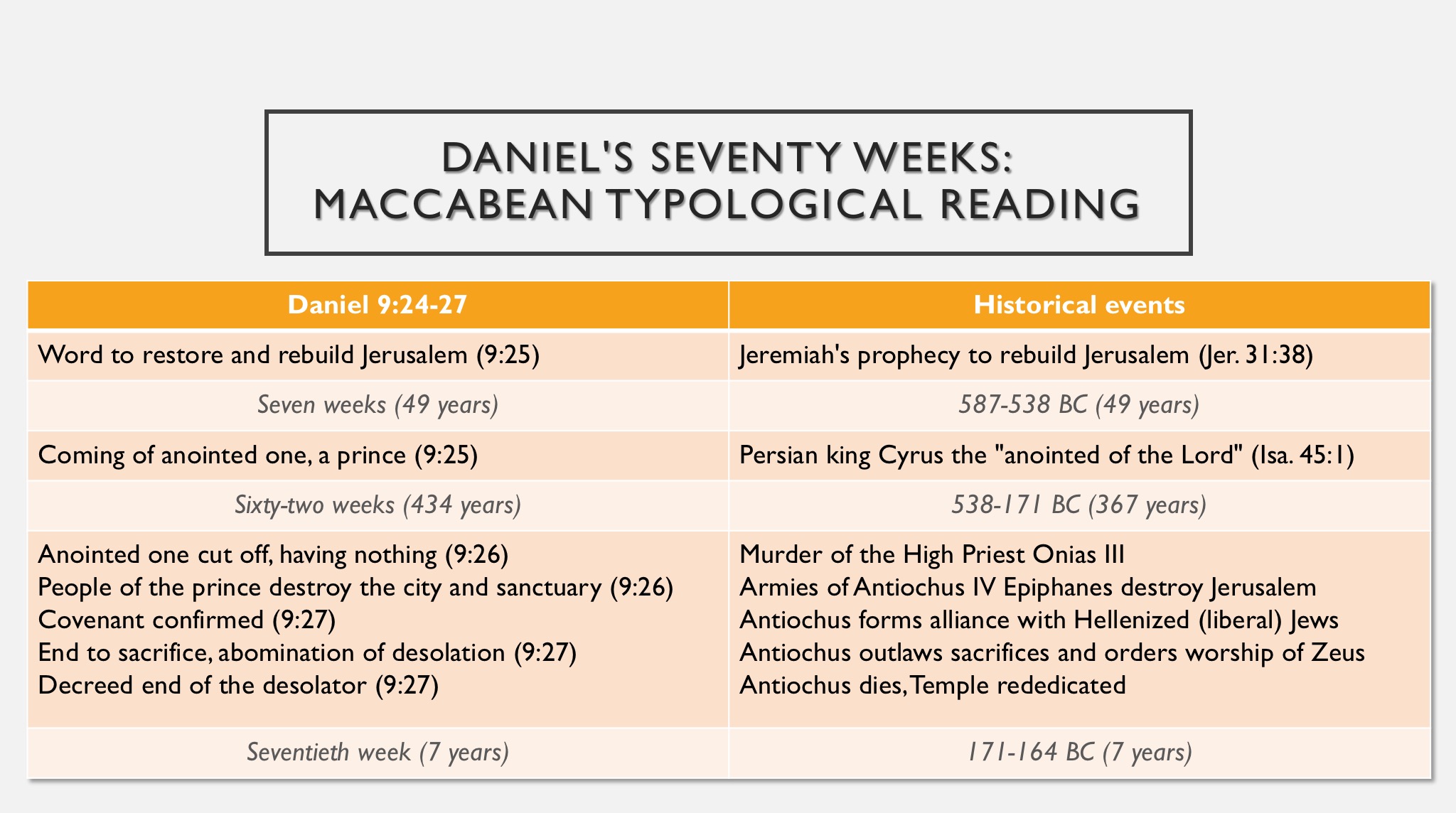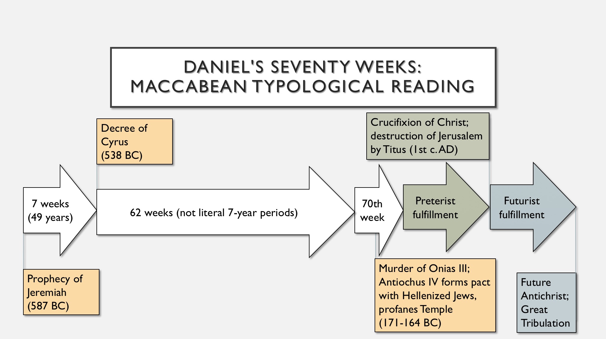The Maccabean-typological view considers the events of Daniel’s prophecy to have been (partially) fulfilled in the second century BC, with the rise and fall of Antiochus IV Epiphanes, who is also mentioned in Daniel 7:24-26; 8:22-26; and 11:20-39. The weeks as a whole are considered symbolic, although the first seven weeks turn out to be very close to 49 years, and the final week is also quite close to seven years. The beginning of the weeks is not a royal decree, but rather Jeremiah’s prophecy of Israel’s restoration, pronounced around 587 BC (Jer. 31). Cyrus is the “anointed one” who arrives after seven weeks, in 539 BC (it is also noteworthy that Cyrus is called the “anointed one” in Isa. 45:1). The second “anointed one,” who is cut off after sixty-two weeks, is the Jewish high priest Onias III, who was murdered in 171 BC. This marks the beginning of the final week, during which time Antiochus makes an alliance with the Hellenized Jews against the traditionalist Jews, destroys the city of Jerusalem, outlaws the Jewish sacrifices, commands the worship of Zeus, and sacrifices a pig in the Temple. The seventieth week ends with the rededication of the Temple and the death of Antiochus in 164 BC. Of course, these events didn’t exactly put an end to sin or usher in everlasting righteousness, but typology allows us to find a greater fulfillment in Christ’s first coming and ultimately second coming. Here’s what it looks like: