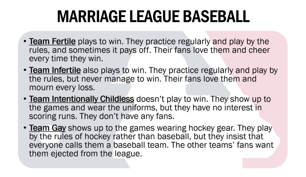As you can see here, whether a straight married couple is fertile or infertile, they are still “playing by the rules” of marriage, even if the marriage does not achieve its goal in procreation. Still, the fact that an infertile couple is unable to have children is a real loss for the couple, even though they are still able to achieve other goods of marriage, such as companionship and emotional support. But the important point is that these other goods shouldn’t run contrary to the structure of marriage itself—a structure that is defined by marriage’s orientation toward procreation. In the same way, a baseball team that never wins might still achieve other goods, such as sportsmanship and teamwork. And yet while other sports might also be able to achieve the goods of sportsmanship and teamwork, those other sports are not baseball.