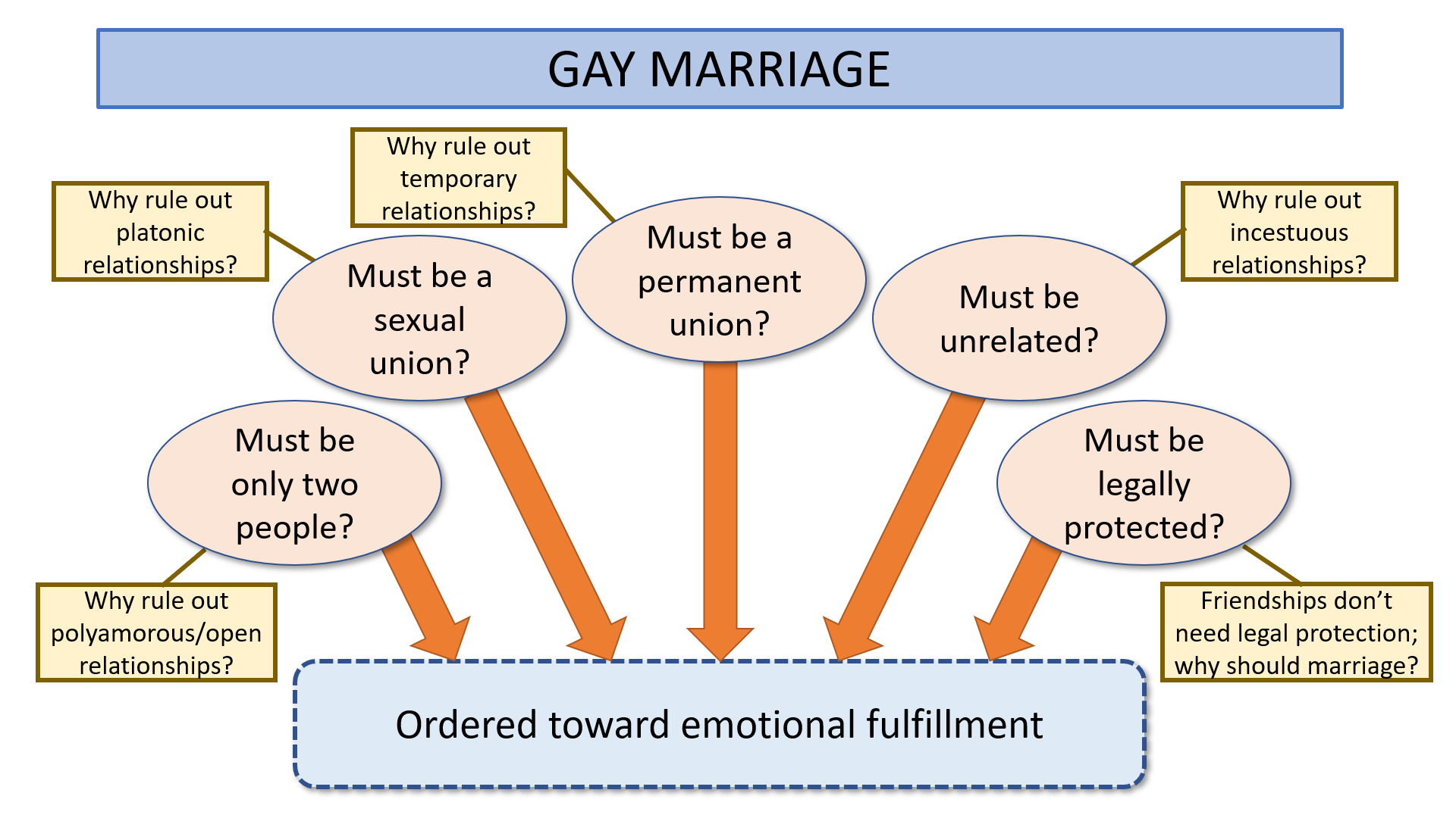 Now don’t think that I’m making a slippery-slope argument here. I’m not saying that allowing gay marriage will inevitably lead to these other types of relationships being called marriage too. What I am saying is that marriage loses its definitional coherence if its foundation is only in spousal emotional fulfillment. Gay marriage proponents can say that marriage should be only between two people, be permanent, etc., but what they cannot do is give a coherent reason why that should be so.